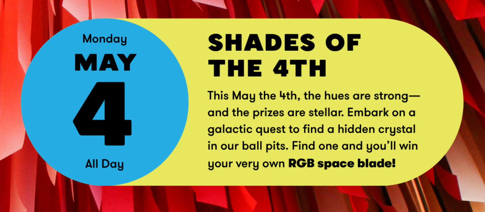 This May 4th, the hues are strong — and the prizes are stellar. Embark on a galactic quest to find a hidden crystal in our ball pits. Find one and you’ll win your very iwn RGB space blade!