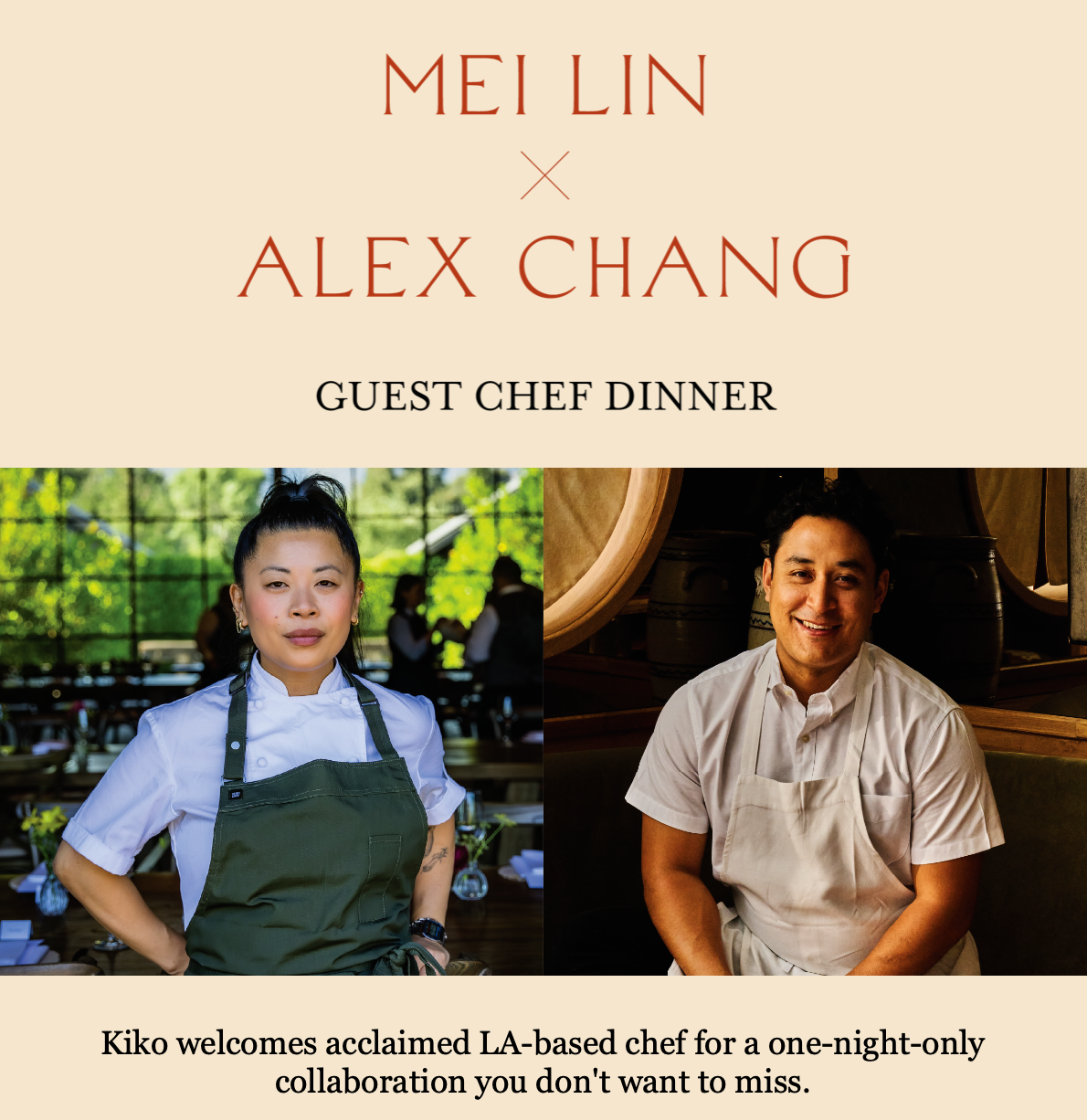On April 8, Kiko welcomes celebrated chef Mei Lin, winner of the twelfth season of Top Chef and owner of 88 Club and Daybird in Los Angeles, for a special guest chef dinner. Known for her refined yet bold approach to modern Asian cuisine, Mei Lin will join chef Alex Chang and the Kiko team for a collaborative five-course tasting menu created exclusively for this one-night-only event.