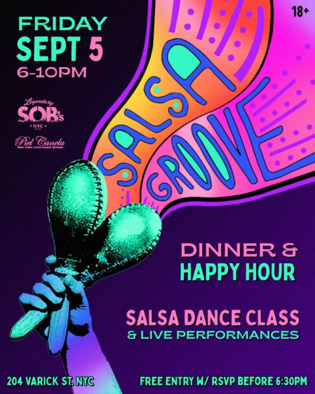Welcome to Salsa Groove: a dinner & drinks happy hour with salsa music, dance lessons, and salsa dance performances. Once a month at SOB’s!