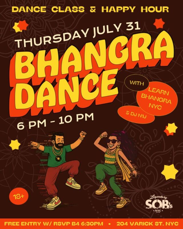 Enjoy a night dancing & drinking with friends, family, partners, and more as you eat dinner, sip on happy hour cocktails, and get free dance lessons from Learn Bhangra NYC. With music by DJ aruniverse to keep the vibes going all night.