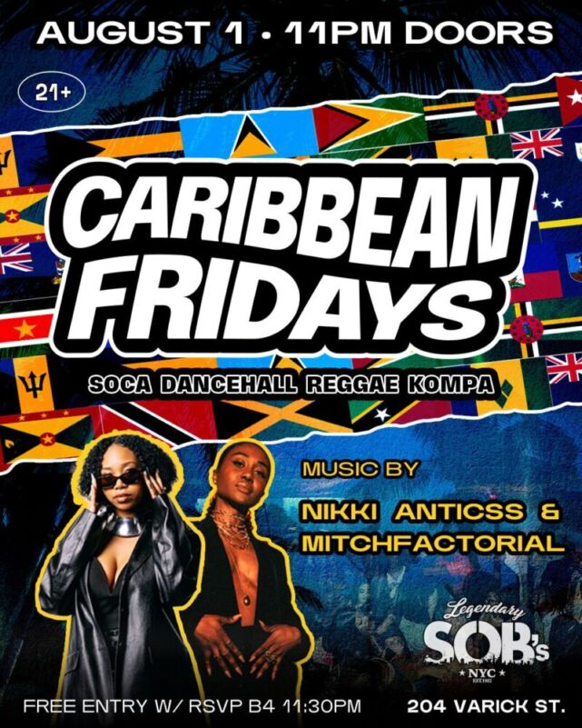 NYC’s original Caribbean Fridays Party is back! Party to soca, dancehall, reggae, kompa, afro-caribbean, & more on Fri Aug 1st from 11pm-late.