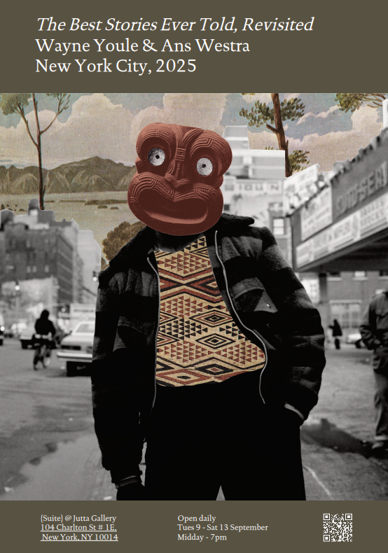 Jutta Gallery, in conjunction with {Suite}, invites you to The Best Stories Ever Told, Revisited — an exhibition of collaborative works by celebrated New Zealand artists Wayne Youle (Ngapuhi, Ngati Whakaeke) and the late Ans Westra CNZM.