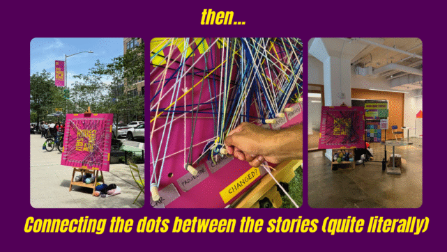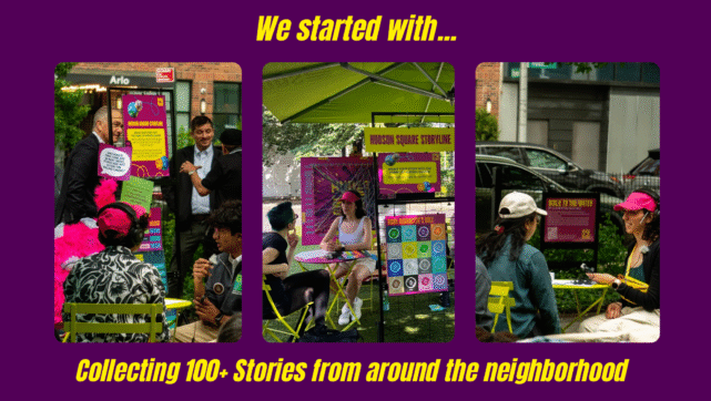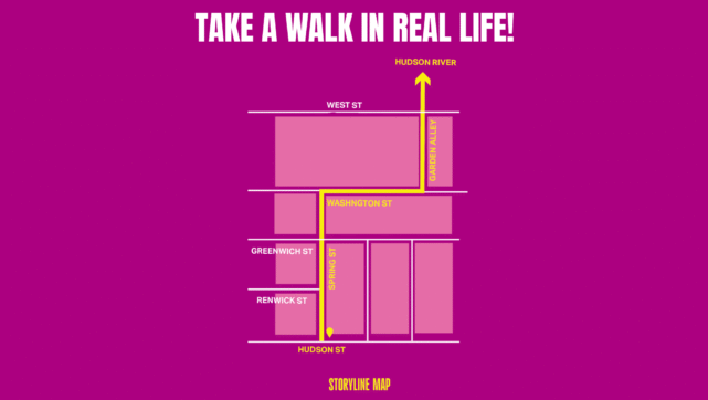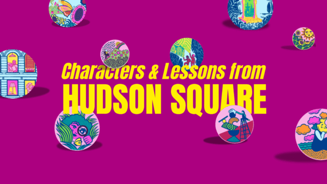 Hudson Square Storyline by Jenny Goldstick is our new iteration of Walk to the Water, an art installation and wayfinding guide directing people from the neighborhood to the waterfront. This iteration is a portrait of Hudson Square built from the stories of its community. Over months, we listened to more than 100 plus stories across Hudson Square, from street corners and plazas to local bars. Through these stories, we identified the common threads that connect people: the moments that changed them, the lessons they’ve learned, and the character roles that define the spirit of the neighborhood. These threads became the inspiration for artworks that transform story data into illustration. Together, they capture the neighborhood’s creative and collaborative energy while reflecting the people who live and work here.
